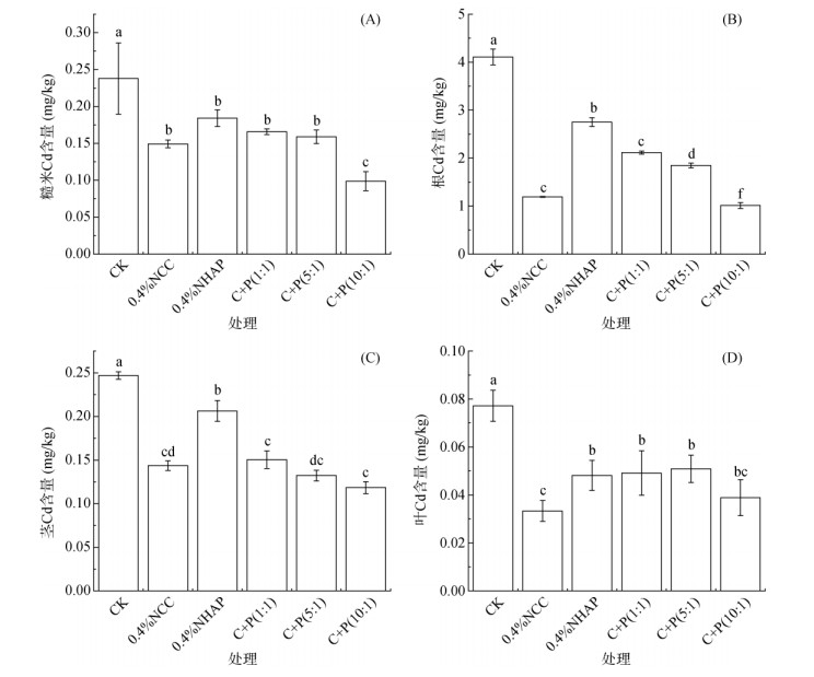 与CK相比,施用NCC和NHAP处理组使水稻根、茎、叶、糙米Cd含量显著降低(P < 0.05,图 4)。叶片中Cd含量显著低于根、茎和糙米中Cd含量。其中C+P(10:1)处理糙米、根和茎中Cd含量最低,相较于CK组显著降低了41.7%、75.4% 和52.0%。0.4%NCC处理叶片中Cd含量最低,相较于CK组显著降低了51.4%。值得关注的是,与CK组相比,各处理组水稻糙米中Cd含量分别降低了37.3%、22.5%、30.3%、33.2% 和41.7%,均低于GB2762—2012《食品安全国家标准食品中污染物限量》[20]中限定的0.2 mg/kg。