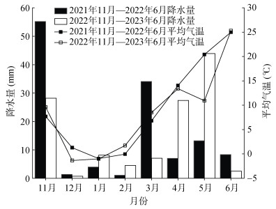 图 1 2021年11月—2022年6月以及2022年11月—2023年6月试验地降水量与平均气温 Fig. 1 Precipitations and average temperatures in test site from November 2021 to June 2022 and from November 2022 to June 2023 |