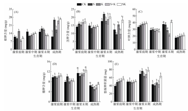 不同喷施处理显著影响不同生育时期小麦各器官钾含量与整株钾积累量(图 2)。S、S+K、SK处理根部钾含量在成熟期达到最高值,分别为25.76、24.92、26.67 mg/g。SK处理与CK处理相比在灌浆前期、成熟期茎钾含量均显著增加,分别为灌浆前期增加22.46%,成熟期增加49.10%。灌浆前期、成熟期叶钾含量均表现为SK>S+K>K>S>CK;与CK、S处理相比,SK处理灌浆前期叶钾含量分别显著增加17.45%、8.92%。SK处理麦穗钾含量在灌浆末期显著高于S处理,在成熟期显著高于K处理。成熟期,SK处理植株的根、茎、叶、穗的钾含量均高于其他处理,其中根、茎两部位与CK处理间差异达显著水平,说明叶面喷施山梨醇螯合钾可以促进成熟期小麦植株对钾的吸收。整株钾积累方面,除灌浆中期处理间差异不显著,其余3个时期SK处理均显著高于CK、K、S+K处理,说明螯合态钾更有利于小麦植株生育期对钾的吸收运移。
