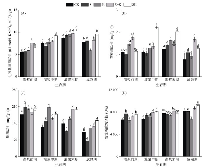 与S+K处理相比,分别提高63.4%、39.4%;小麦灌浆前期和成熟期S+K处理土壤蔗糖酶活性最高,比SK处理显著提高53.5%、29.0%。SK处理在小麦成熟期土壤脲酶活性显著高于CK、S、K、S+K处理,分别提高46.8%、129.0%、26.6%、17.4%;小麦灌浆末期,S+K与SK处理间脲酶活性差异不显著,但与CK相比分别显著提高44.5%、43.5%。SK处理在小麦成熟期酸性磷酸酶活性也显著高于其他处理,与CK、S、K、S+K处理相比,分别提高13.8%、14.6%、38.7%、7.9%。