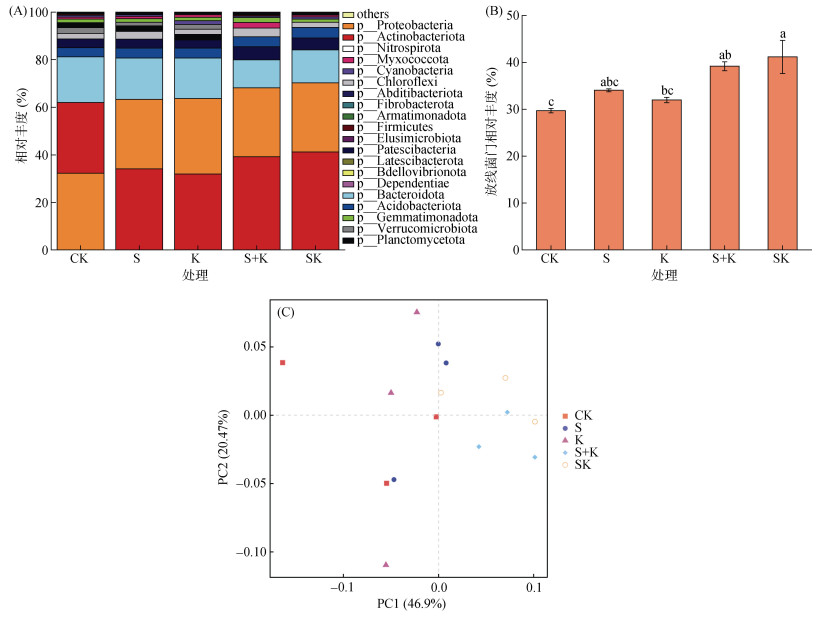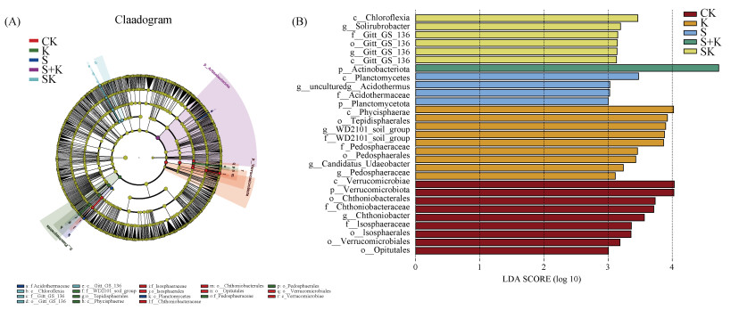 物种差异分析(LEfSe)与线性判别分析(LDA>3)基于对物种差异检验进而分析不同处理间富集的差异物种。从图 5A可以看出,S、K、S+K、SK处理的差异物种主要分布在纲、目、科水平上。其中,CK、S、K和SK处理分别有7、2、5、4个显著差异的菌种,而S+K处理没有显著差异的菌种。线性判别分析结果展示了同组中丰度有显著差异的物种以及对其组间差异效果影响程度,LDA值越大,表示该物种丰度对差异的贡献度越大。LDA分析结果表明(图 5B),CK、S、K、S+K、SK处理分别有9、3、9、1、6个富集物种。阈值大于3.0的差异物种主要来自放线菌门(Actinobacteriota)、绿弯菌门(Chloroflexi)、浮霉菌门(Planctomycetes)、变形菌门(Proteobacteria)、厚壁菌门(Firmicutes)、疣微菌门(Verrucomicrobiota)。结果表明,CK与K处理富集物种相同,但K处理多数物种相对丰度小于1%,表明叶面喷施对富集物种丰度影响较小。S+K处理放线菌门(Actinobacteriota) LDA值最高,表明该物种显著影响根际土壤微生物组间差异程度。