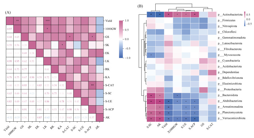 (Yield:产量;1000GW:千粒重;GS:穗粒数;RK:根钾含量;SK:茎钾含量;LK:叶钾含量;EK:穗钾含量;S-CAT:土壤过氧化氢酶;S-SC:土壤蔗糖酶;S-UE:土壤脲酶;S-ACP:土壤酸性磷酸酶。*、**、***表示相关性达 P<0.05、P<0.01、P<0.001 显著水平) 图 6 小麦产量及其构成要素、钾元素分布和土壤酶活性相关性热图(A)及各要素与细菌门水平优势物种相关性热图(B) Fig. 6 Correlation heat map of yield and its components, potassium distribution, soil enzyme activities (A), and correlation heat map between the above elements and dominant species at bacterial phylum level (B) |