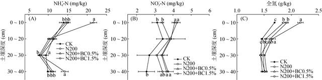 2 结果与分析 2.1 土壤NH4+-N,NO3–-N和全氮如图 1A所示,土壤NH4+-N含量随剖面深度增加呈先减后增的规律:0 ~ 30 cm剖面逐渐下降,而在30 ~ 40 cm剖面上升。同土层不同处理间比较发现:在0 ~ 10 cm剖面中,N200+BC0.5% 处理的NH4+-N含量达到最大值21.6 mg/kg,比N200和N200+BC1.5% 处理显著提高49.1% 和44.1%;各处理10 ~ 20 cm土壤NH4+-N含量无显著差异;与CK处理相比,N200处理20 ~ 30 cm土壤NH4+-N显著降低15.2%,但与生物质炭处理间没有显著差异;在30 ~ 40 cm剖面中,N200处理的NH4+-N含量达到14.2 mg/kg,比其他处理显著提高27.4% ~ 32.8%。