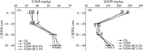 2.2 土壤有效磷与速效钾由图 2A可知,土壤有效磷含量由10 ~ 20 cm的35.1 ~ 40.8 mg/kg大幅提高至20 ~ 30 cm的54.1 ~ 57.3 mg/kg。在0 ~ 20 cm剖面,施氮处理的土壤有效磷含量较CK处理明显降低,0 ~ 10 cm和10 ~ 20 cm降幅分别为10.3% ~ 17.3% 和8.5% ~ 13.8%。同时结果表明,与N200处理相比,N200+BC0.5% 与N200+BC1.5% 的0 ~ 40 cm土壤有效磷含量均无显著差异;但是,10 ~ 40 cm土壤的有效磷含量在添加生物质炭处理中有上升趋势,且该趋势在N200+BC1.5% 处理下更明显。
