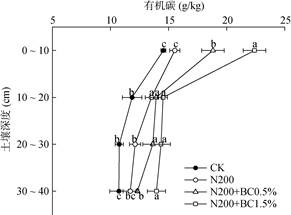 2.3 土壤有机碳纵观0 ~ 40 cm剖面,SOC含量在0 ~ 10 cm最高,为14.6 ~ 22.4 g/kg,然后逐渐降低至30 ~ 40 cm的10.7 ~ 14.0 g/kg(图 3)。同土层不同处理间比较发现:与N200处理相比,添加生物质炭处理可提高SOC含量,特别是高用量处理(N200+BC1.5%)。其中,添加生物质炭处理0 ~ 10与20 ~ 30 cm的SOC含量较N200处理分别显著提高21.1% ~ 44.2% 和12.6% ~ 18.4%。图 3结果同时表明,30 ~ 40 cm深度土壤SOC含量仅在高用量施用生物质炭(1.5%)时显著提高19.3%,低用量(0.5%)时无显著影响。