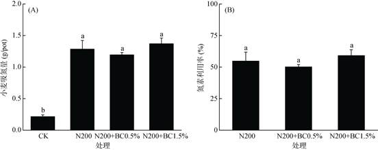 图 4结果表明,施氮处理的小麦吸氮量较CK处理显著提高4.6倍~ 5.4倍(图 4A)。但与单施氮肥处理相比,生物质炭添加对小麦吸氮量与氮素利用率均无显著影响(图 4B)。