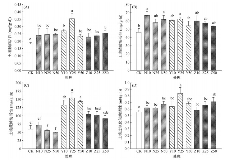 由图 1A可知,与CK处理相比,生物质炭配施牛粪有机肥(N10、N25和N50)对土壤脲酶活性的影响差异不显著,而在生物质炭配施羊粪或猪粪有机肥中,Y10、Y25和Z50处理显著提高了土壤脲酶活性,其中Y25处理提高最多。生物质炭配施有机肥处理对土壤磷酸酶活性提高范围为15.63% ~ 44.56%(图 1B),其中N10、N50和Y25处理与CK处理差异显著。生物质炭配施不同种类有机肥对蔗糖酶活性影响较大(图 1C),与CK处理相比,生物质炭配施牛粪有机肥处理影响不显著,而配施羊粪和猪粪有机肥处理蔗糖酶活性均显著增加,其提升幅度分别为122.41% ~ 158.31% 和53.95% ~ 76.67%。由图 1D可知,生物质炭配施有机肥对土壤过氧化氢酶活性影响较小,仅Y25和Z50处理较CK处理活性显著增加,其余处理差异不显著。