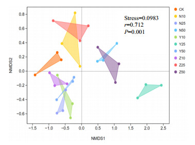 非度量多维尺度分析(NMDS)结果显示(图 2),土壤细菌群落在不同处理间差异显著(stress=0.098 3)。CK处理与大部分施肥处理的菌群分离,其中N10、Y10、Z10处理与CK处理距离较近,说明10% 生物质炭与90% 有机肥添加处理的土壤细菌群落与CK处理相似,而N50、Y25和Z50处理的菌群与CK处理距离较远,在NMDS1轴存在显著分异,说明这3个处理的土壤细菌β多样性存在明显的差异。ANOSIM分析表明,生物质炭配施不同种类的有机肥以及不同的配施比例能显著改变土壤细菌群落结构(r=0.712,P=0.001)。