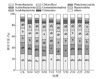 从表 3可知,在不同处理下,土壤细菌丰富度和多样性不同,与CK处理相比,N50、Y10、Y50、Z25和Z50处理的物种观察数、Chao 1指数显著提高,N50、Y10、Y25、Z25和Z50处理的Shannon指数和Simpson指数显著提高。在各处理中,N50处理的物种观察数、Chao1指数、Shannon指数和Simpson指数均最高,表明本试验中N50处理最利于提高土壤细菌的丰度和α多样性。