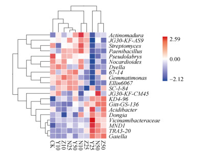 2.3.3 生物质炭配施有机肥对土壤细菌属群落组成的影响图 4为生物质炭配施有机肥处理下属水平细菌群落结构聚类热图。由图 4可知,所有处理的细菌群落结构聚类为两个大的分支,Y25、N50和Z50处理组成其中一个分支,CK和其余处理组成另一个分支,说明前3个处理的土壤细菌群落结构与CK处理相比有显著差异。在CK处理中,优势细菌属为Pseudolabrys、Nocardioides、Dyella、67-14和Streptomyces,而在Y25、N50和Z50处理中则降低了上述菌属的相对丰度,而Vicinamibacteraceae、MND1、TRA3-20、Gaiella、KD4-96等菌属相对丰度明显增加,成为优势菌属。