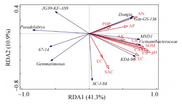 将土壤理化性质、土壤酶活性和细菌属作为指标进行RDA分析,获得二维排序图(图 5),RDA1和RDA2分别解释了土壤细菌群落变异的41.3% 和10.9%。环境因子中pH对土壤细菌属水平群落结构的解释率最高,为35.3%(P=0.002),其次是碱解氮,解释率为8.4%(P=0.006),均达到了极显著水平(P < 0.01)。而有效磷和电导率对土壤细菌群落的解释率分别为5.3% 和5.5%,均达到显著影响(P=0.014)。pH、全氮、过氧化氢酶活性、有机质、脲酶活性、速效钾含量与MND1、Vicinamibacteraceae、KD4-96三个菌属相对丰度呈正相关,而与JG30-KF-CM45、Pseudolbrys、67-14和Gemmatimonas菌属相对丰度呈负相关。pH和碱解氮是影响群落结构变异的主要因素,对群落结构变异影响达到极显著水平(P < 0.01)。