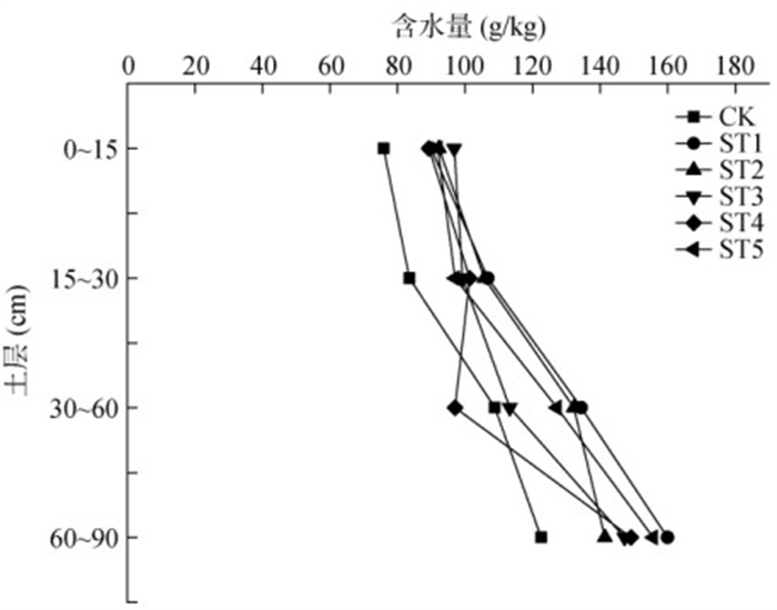 由图 1可知,施用秸秆能够有效提高各土层含水量,其中,灌水前,在15 ~ 30 cm土层ST1和ST2处理与CK处理相比分别显著增加了27.5%、26.3%。