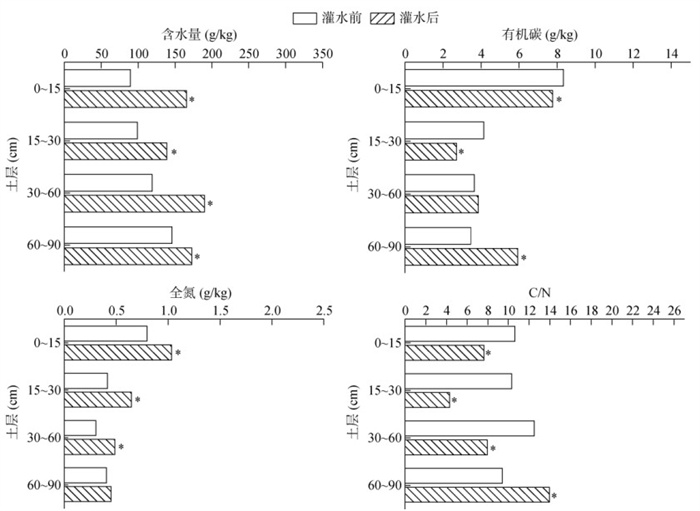 由图 2可知,灌水后,0 ~ 15和15 ~ 30 cm土层SOC含量比灌水前分别显著降低了7.3% 和53.0%;30 ~ 90 cm土层SOC含量与灌水前相比均有增加,尤其在60 ~ 90 cm土层显著增加了71.6%;不同土层TN含量与灌水前相比均表现增加趋势,具体为0 ~ 15、15 ~ 30、30 ~ 60 cm土层分别显著增加了30.0%、55.7%、60.6%;C/N表现为60 ~ 90 cm土层与灌水前相比显著增加了48.4%,其余土层与灌水前相比均显著下降,降幅分别为39.2%、141%、57.1%。各土层土壤含水量比灌水前显著增加了18.2% ~ 85.2%。