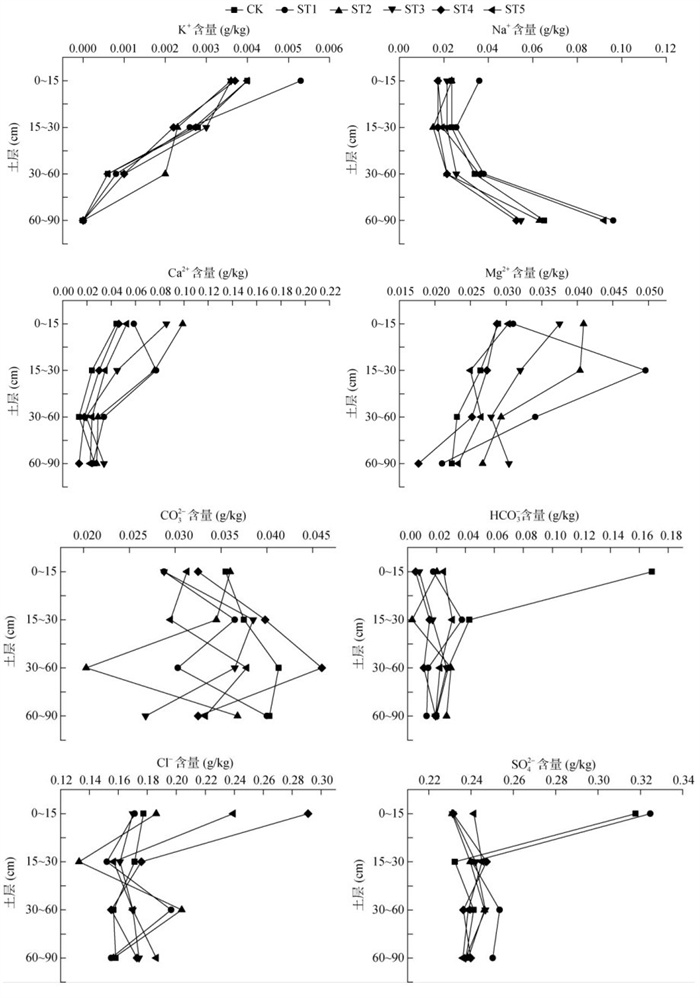 图 3 不同用量秸秆还田条件下盐碱地灌水前盐分离子含量 Fig. 3 Salt ion contents before irrigation in saline-alkali farmlands under different rates of straw returning |