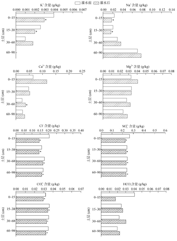 由图 4可知,灌水前,不同土层K+含量在0 ~ 15 cm土层最高,Na+含量在60 ~ 90 cm土层中含量最高。灌水后,K+和Na+含量在0 ~ 30 cm土层表层土壤中均显著下降,降幅分别为30% ~ 33.3%、25.9% ~ 31.8%。与灌水前相比,Ca2+含量在灌水后各土层中均呈现增加趋势,尤其在30 ~ 60 cm土层中显著增加,增幅为55.4%。灌水前,CO32–、HCO3–、Cl–、SO42–在各个土层中含量分布均匀,灌水后Cl–、SO42–以及CO32–含量在各土层中与灌水前相比均显著下降,降幅分别为5.5% ~ 43.1%、4% ~ 7.6%、4.7% ~ 9.0%;且各离子含量均由表层向深层迁移。