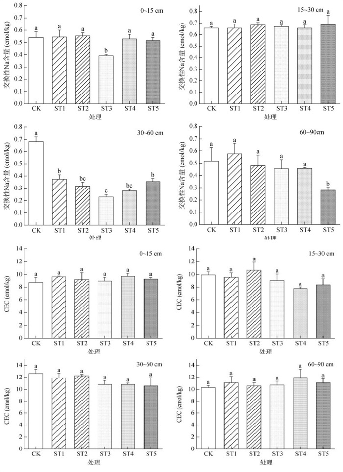 由图 5可知,秸秆还田可以有效降低深层土壤交换性Na含量,具体表现为30 ~ 60 cm土层中添加秸秆的各处理与CK处理相比均显著下降,降幅为45.6% ~ 66.2%,60 ~ 90 cm中ST5处理与CK相比显著下降,降幅为46.2%。0 ~ 15 cm及60 ~ 90 cm土层,各添加秸秆处理CEC与CK处理相比均有提高,0 ~ 15 cm土层中增幅为2.4% ~ 10.7%,60 ~ 90 cm土层增幅为2.8% ~ 16.1%。