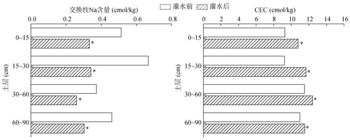 由图 6可知,与灌水前相比,灌水后各土层交换性Na含量均显著降低,降幅为4.3% ~ 48.9%;而CEC含量表现为在各土层中均显著增加,增幅为5.1% ~ 26.5%。