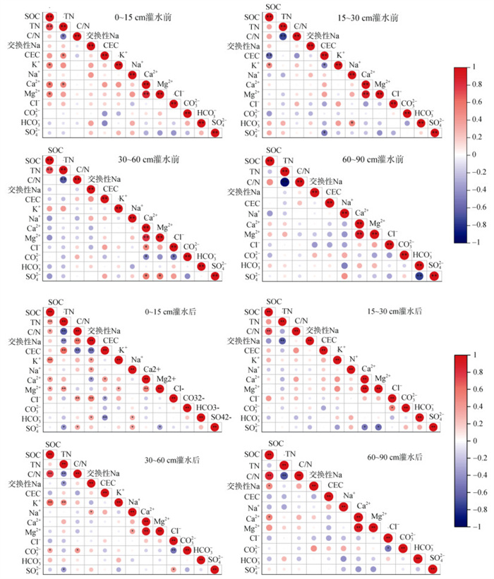 由图 7可知,灌水前,0 ~ 15 cm土层SOC与TN呈极显著正相关(P < 0.01),与Ca2+、Mg2+呈显著正相关(P < 0.05);30 ~ 60 cm土层SOC与TN呈极显著正相关(P < 0.01)。灌水后,SOC与盐分指标相关关系发生了改变,具体表现为:在0 ~ 90 cm土层SOC和TN及C/N呈极显著正相关(P < 0.01),0 ~ 15 cm土层SOC与CEC、Ca2+、Mg2+呈显著正相关(P < 0.05),60 ~ 90 cm土层SOC与Ca2+呈显著正相关(P < 0.05)。