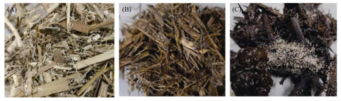 图 1 不同预处理玉米秸秆照片:原始玉米秸秆(A)、玉米秸秆未接种真菌堆肥(B)和玉米秸秆接种真菌堆肥(C) Fig. 1 Images of differently pretreated maize straws: Original maize straws (A); Composted maize straws under no fungi inoculation (B); Composted maize straws under fungi inoculation (C) |