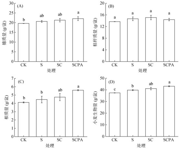 不同处理下小麦的生物量如图 2所示。与CK处理相比,SCPA处理显著提高了小麦穗质量12.7%,根质量35.8% 和总生物量15.3%;S和SC处理则显著提高了小麦的总生物量。与S处理相比,SCPA处理显著提高了小麦的根质量和总生物量;而SCPA处理与SC处理间各生物量指标间无显著差异。