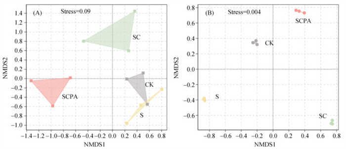 通过非度量多维尺度分析(Non-metric Multidimensional Scaling,NMDS)发现,不同处理下土壤细菌和真菌群落结构差异显著(Stress < 0.1)(图 3)。对于土壤细菌群落,S和CK处理聚集并与SC和SCPA处理显著分离,且SC和SCPA处理沿NMDS2轴分布(图 3A)。对于土壤真菌群落结构,各处理真菌群落结构差异显著,相比土壤细菌群落结构分离趋势更加明显(图 3B)。