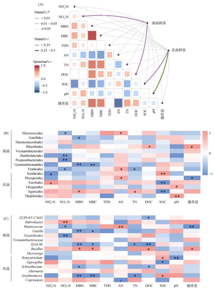 土壤DOC和NO3–-N与土壤细菌群落组成的Mantel显著值最小(Mantel’s P=0.01 ~ 0.05),且对细菌群落的解释值最大(Mantel’s r=0.25 ~ 0.5),表明土壤DOC和NO3–-N含量是调控土壤细菌群落组成的主要因子(图 4A)。土壤DOC含量与MBN含量呈显著正相关,并且与根瘤菌目(Rhizobiales)和芽孢杆菌属(Bacillus)相对丰度也存在显著正相关关系。土壤NO3–-N含量与土壤微球菌目(Micrococcales)、伯克氏菌目(Burkholderiales)和丙酸杆菌目(Propionibacteriales)相对丰度呈显著负相关。土壤MBN含量与土壤盖亚女神菌目(Gaiellales)和芽单胞菌目(Gemmatimonadales)相对丰度呈显著负相关,而与芽孢杆菌属(Bacillus)相对丰度呈显著正相关。此外,小麦穗质量与土壤中MBN、MBC、TN和DOC含量存在显著正相关关系,同时,也与土壤中根瘤菌目(Rhizobiales)和芽孢杆菌属(Bacillus)相对丰度呈显著正相关(图 4)。