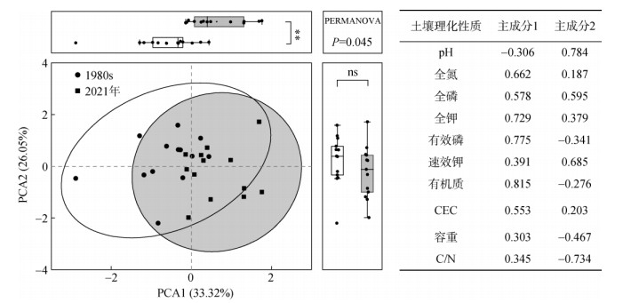 2 结果与分析 2.1 土壤肥力变化特征对两次采样的土壤基本理化指标进行成对样本t检验,其中pH、全钾、有效磷、有机质、CEC和碳氮比(C/N),在40年间差异显著(P < 0.05),其他指标无显著变化(P > 0.05)(表 3)。40年来,土壤pH降低,部分点位由中性或石灰性土转化为酸性土;其他指标值均呈增加趋势,全钾含量提高了50.68%,有效磷含量提高了268.89%,土壤保肥指标CEC提高了21.19%,有机质含量提高了24.70%,同时土壤C/N也随之升高。对土壤理化性质进行主成分分析和置换多元方差分析,结果表明,40年来土壤性质总体变化显著,以全钾、有效磷和有机质为主导的土壤养分含量变化是造成土壤性质改变的主要因素(图 2)。
