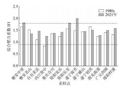 (图中虚线划分的3个综合肥力系数范围从上到下分别表示土壤肥力等级四、三、二等) 图 3 典型紫色土的综合肥力系数 Fig. 3 Integrated fertility index of typical purple soils |