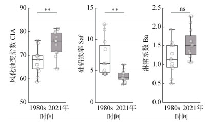 本文选取风化蚀变指数(CIA)、硅铝铁率(Saf)和淋溶系数(ba)3个指标对土壤的化学风化进行评估(图 4)。研究表明,不同范围CIA值能反映不同的风化程度,当CIA=50 ~ 60时,表示土壤或岩石处于弱风化程度;当CIA=60 ~ 80时,为中等风化程度;当CIA=80 ~ 100时,为强烈风化程度[23]。全国第二次土壤普查时期研究区土壤CIA值介于58.66 ~ 76.19,2021年土壤CIA值介于64.12 ~ 81.32,说明川中丘陵区典型紫色土主要处于中等风化程度,40年间土壤的风化程度显著加深(P < 0.01)。全国第二次土壤普查时期土壤硅铝铁率为4.49 ~ 12.42,2021年土壤硅铝铁率为2.79 ~ 6.03,显著减小(P < 0.01),所表征的脱硅富铝铁化程度加强。全国第二次土壤普查时期土壤淋溶系数为0.49 ~ 1.93,2021年淋溶系数为1.07 ~ 2.28,表明土壤不稳定元素淋失度更小,但差异不显著(P > 0.05)。