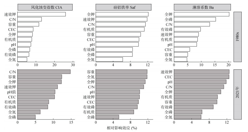 进行聚类推进树算法(ABT)分析,结果显示,全国第二次土壤普查时期,土壤性质中速效钾是影响研究区土壤风化蚀变指数的主要因子(26.00%),相对贡献率远高于其他因子(图 5);全钾是影响土壤淋溶系数的首要因子(20.25%),其次是全磷(15.30%)和C/N(13.1%)。2021年,土壤性质中C/N是影响土壤风化蚀变指数的首要因子(14.78%),其次是容重(12.37%)和全钾(12.28%);除全磷对土壤硅铝铁率的相对贡献率显著小于其他因子外,其他因子的相对贡献率差异不大,其中容重(11.86%)、全氮(11.84%)、全钾(11.43%)和碳氮比(11.07%)为影响硅铝铁率的主要因子;影响土壤淋溶系数的主要因子是速效钾(12.55%)和CEC(12.51%)。