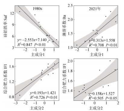 在以上因素的综合作用下,川中丘陵区典型紫色土综合肥力得到显著提升(P < 0.05)。但值得注意的是,据农业部耕地质量监测点的数据,多种土壤类型中紫色土中有机质和全氮含量最低[35]。本研究将两个时期土壤理化性质分别进行主成分分析(表 6),并与土壤综合肥力系数进行回归拟合(图 6),结果同样显示,全氮和有机质是限制土壤综合肥力提升的主要因素。因此,今后在对紫色土开发利用时需针对性地提升土壤全氮和有机质含量,保持土壤养分平衡,并且防治土壤酸化,降低土壤肥力退化的风险。