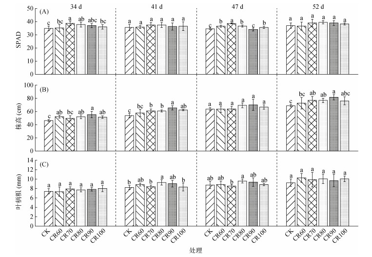 不同螯合率处理对芹菜叶片中叶绿素含量的影响显著,定植34和41 d时,CK处理的SPAD值均为最低(图 1A)。定植47 d时,CR60、CR70、CR80和CR100处理的SPAD值,与CK处理相比显著增加3.06% ~ 11.5%。定植41和52 d时,各螯合率处理间的SPAD值均无显著差异,但高于CK处理。随着生育期的推进,不同螯合率处理对芹菜株高和叶柄粗产生影响(图 1B、1C)。定植34、41、47和52 d,CK处理的株高均为最低,CR90处理最高。芹菜生长至41 d时,CR90处理的株高,与CK、CR60、CR70、CR80处理相比显著增加7.41% ~ 21.8%;52 d时,CR90处理的株高达到最高81.7 cm,与CK处理相比显著提高18.7%,而各螯合率处理间均无显著差异。CR80、CR90处理的叶柄粗在定植41 d时与CK、CR70和CR100处理相比分别增加10.6% ~ 12.9%、7.48% ~ 9.67%,CR80处理增加较为显著。