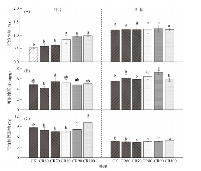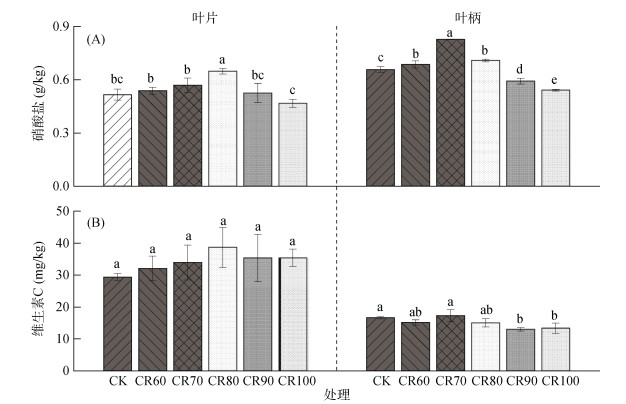 蔬菜品质一般包括营养品质和卫生品质。硝酸盐属卫生品质范畴,维生素C、可溶性糖、可溶性固形物及可溶性蛋白属营养品质。随着山梨醇螯合钾螯合率提高,芹菜叶柄和叶片的硝酸盐含量均先升高后下降(图 2A)。CR70处理的叶柄以及CR80处理的叶片硝酸盐含量最高,分别为0.83、0.65 g/kg,与CK处理相比分别显著提高25.8%、10.3%;CR90和CR100处理的叶柄硝酸盐含量与CR60、CR70、CR80处理相比分别显著降低13.8% ~ 28.4%、21.2% ~ 34.6%,叶片硝酸盐含量分别降低2.34% ~ 18.9%、13.2% ~ 27.9%。如图 2B所示,处理间叶片维生素C含量无显著差异;叶柄维生素C含量随螯合率的提升而下降,与CK、CR70处理相比,CR90和CR100处理的叶柄维生素C含量分别显著降低21.6%、24.8% 和19.7%、22.9%。