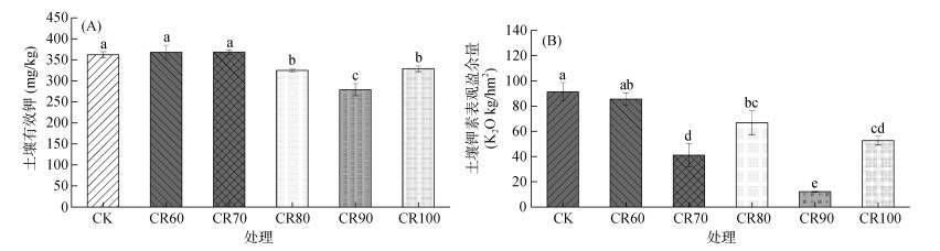 不同螯合率山梨醇螯合钾喷施显著影响收获期土壤剩余有效钾含量(图 4A),CR90处理的土壤有效钾含量最低,为278.8 mg/kg,与CK、CR60、CR70、CR80、CR100处理相比显著降低16.45% ~ 24.40 %。图 4B为芹菜收获后农田钾素表观盈余量的状况,通过计算土壤–芹菜系统钾素表观平衡发现,不同螯合率山梨醇螯合钾喷施对土壤钾素平衡状况影响较大,整体表现出正平衡;以CK处理盈余量最高,为K2O 91.28 kg/hm2,而各螯合率处理盈余量较CK处理降低6.33% ~ 86.8%,除CR60处理外其他处理差异显著;CR90处理盈余量最低,仅K2O 12.11 kg/hm2。
