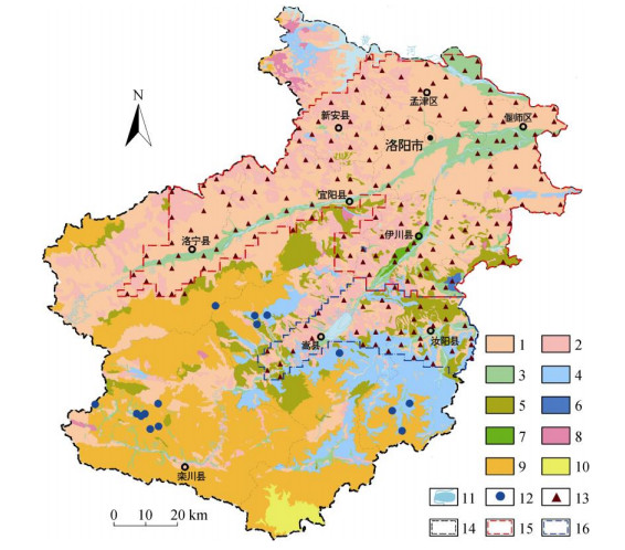 (1:褐土;2:红黏土;3:潮土;4:石质土;5:粗骨土;6:砂浆黑土;7:水稻土;8:紫色土;9:棕壤;10:黄棕壤;11:水系和水库;12:钼矿点;13:2022年采样点位置;14:洛阳市行政区界;15:2004年多目标调查范围;16:2018年多目标调查范围) 图 1 采样点位置和土壤类型 Fig. 1 Sampling sites and soil types |