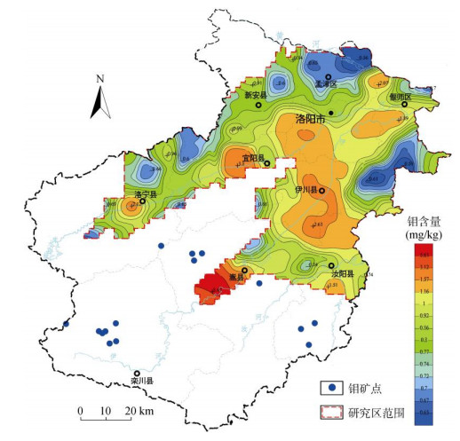 4 结论1) 研究区土壤钼平均含量为1.09 mg/kg,高于河南省及全国土壤钼平均值,呈富集特征,整体表现为南部高、北部低的特征,距离钼矿区越近含量越高。