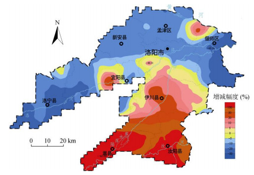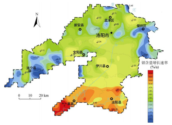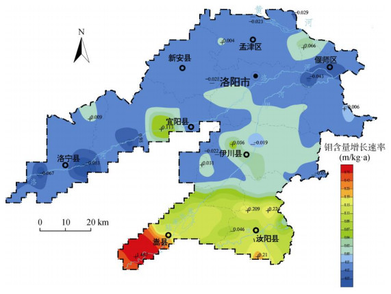 2) 近20a来,研究区内土壤钼元素含量整体未变,区内土壤中钼的补充与流失达到持平,但对比同一点位钼含量,变化差异大。钼含量减少的点位多,但是减少幅度均相对较小,增长的点位相对较少,但增长幅度较大,北部洛宁-新安-孟津-偃师一带钼含量显著负增长,南部伊川-嵩县-汝阳以及宜阳县西部、偃师区西北部显著正增长。