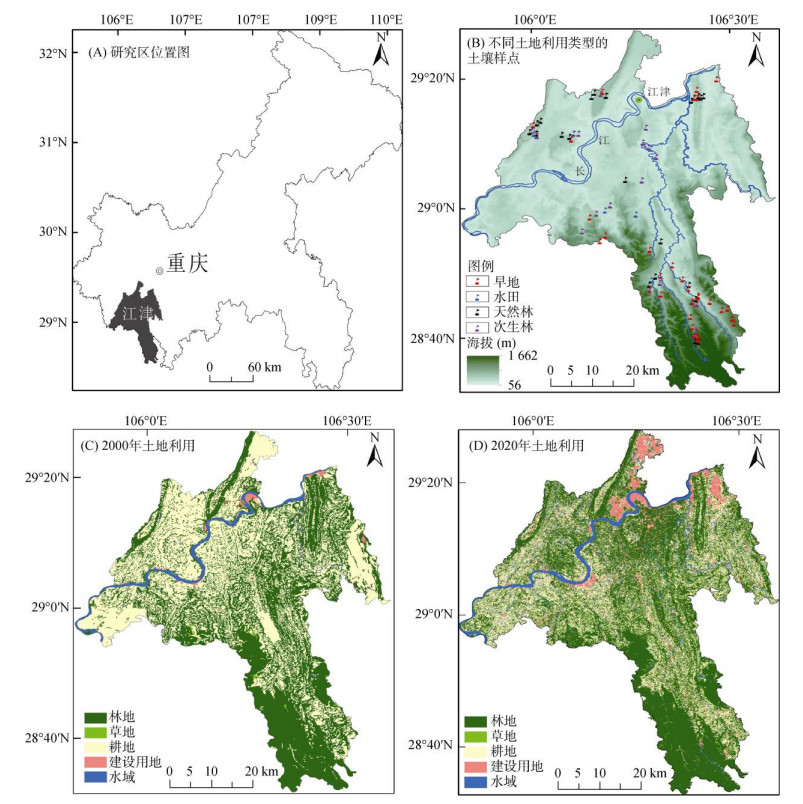因此,本研究以实施“退耕还林”近20年的重庆江津区为例,探究土壤硒含量及其赋存形态对土地覆被变化的响应以及土地覆被变化影响土壤硒含量和赋存形态的主要因素。研究结果将有助于评估和预测土地覆被变化背景下土壤质量变化对作物硒累积的影响,从而为富硒农业生产和调控居民硒营养提供科学依据。