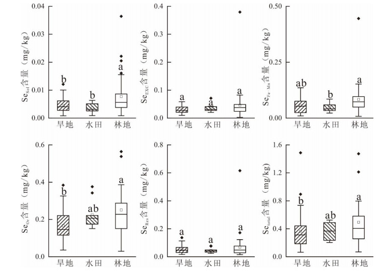 (SeSol:水溶态硒;SeExc:可交换态与碳酸盐结合态硒;SeFe-Mn:铁锰氧化物结合态硒;SeOr:有机结合态硒;SeRes:残渣态硒;Setotal:总硒。箱式图内中间实线表示中值,白色小方框表示平均值,箱体的下边缘线、上边缘线、下误差线、上误差线分别表示25、75、5、95百分位数;不同小写字母表示不同土地覆被下硒赋存形态存在显著差异(P < 0.05)。下图同) 图 2 不同土地覆被类型下土壤硒赋存形态特征 Fig. 2 Characteristics of soil Se forms under different land use/cover types |