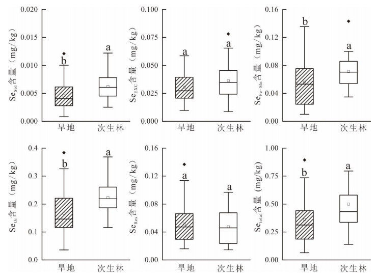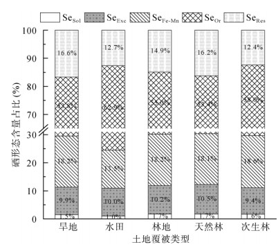 2) 土地覆被转换对土壤硒含量及其赋存形态具有显著影响。旱地转次生林后,次生林地土壤的总硒含量及其水溶态硒、铁锰氧化物结合态硒和有机结合态硒的含量均有所增加。