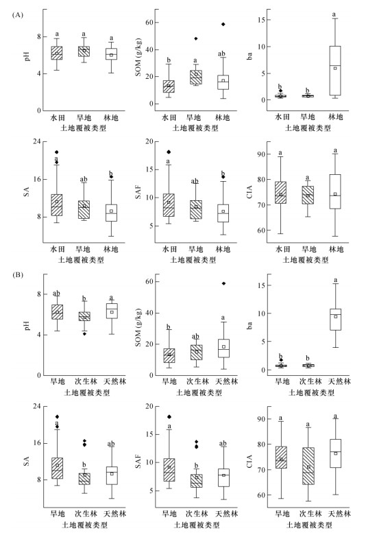 研究区林地土壤总硒及其赋存形态均高于旱地和水田(图 2),次生林地土壤硒含量及其赋存形态也均高于旱地(图 3)。前人研究表明,不同土地利用方式会对土壤基本理化性质产生影响[19–21],这可能是土地覆被变化对土壤硒含量及其赋存形态产生影响的主要因素。图 4显示,研究区土地覆被变化导致土壤pH、有机质、硅铝比和硅铝铁比具有显著性差异(Kruskal-Wallis非参数检验,P < 0.05)。