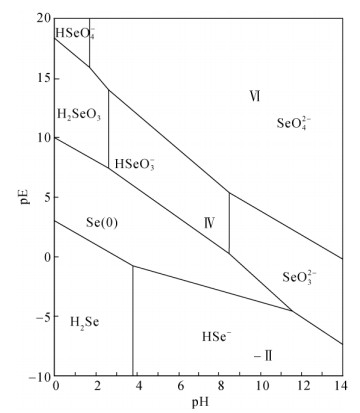 图 5 硒的pE-pH图(25℃,1 bar,离子强度为0)[22] Fig. 5 pE-pH diagram of Se (at 25℃, 1 bar, Ionic Strength = 0) |