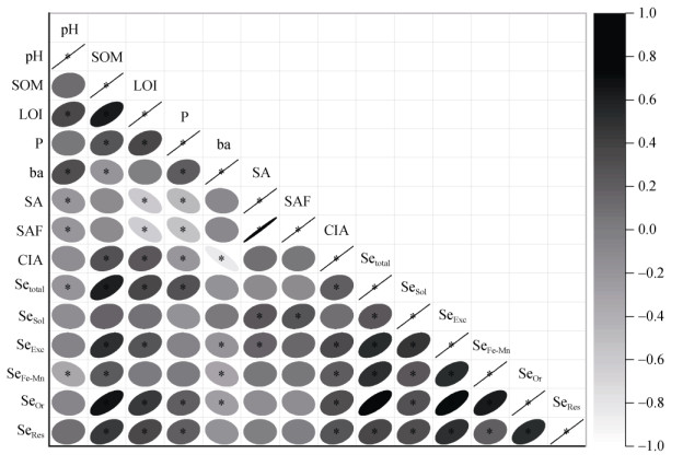 (*表示相关性达P < 0.05显著水平) 图 6 土壤硒赋存形态与土壤基本理化参数相关性热图 Fig. 6 Correlation Heatmap of soil Se forms with soil basic properties |