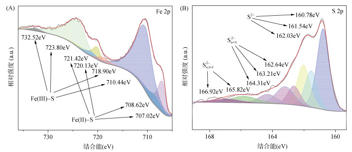 为探究本研究合成的FeS矿物的化学结构和元素表面价态,对其进行XPS谱图分析,结果如图 2所示。Fe 2p轨道(图 2A)的拟合结果显示,在结合能为732.52、723.80、718.90、710.44 eV出现的特征峰代表Fe(Ⅲ) –S键,而结合能为721.42、720.13、708.62、707.02 eV的特征峰代表Fe(Ⅱ) –S键,Fe(Ⅲ)和Fe(Ⅱ)的含量占比分别为74.47% 与25.53%。S 2p图谱的拟合结果(图 2B)中,结合能为160.78、161.54和162.03 eV的峰为S2–;结合能为162.64、163.21和164.31 eV的峰为Sn2–(n < 4),结合能为165.82和166.92 eV的峰为Sn2–(n≥4)。