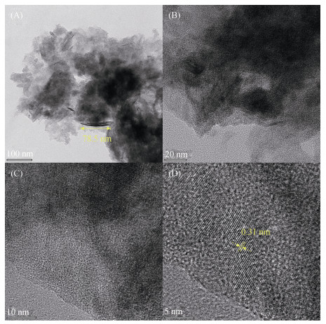 2.1.3 TEM分析采用TEM对本研究合成的FeS矿物表面形貌进行观察,结果如图 3所示。本研究合成的FeS矿物呈现表面褶皱团聚的不规则球状,并在其周围有片状物质,无定形和晶格条纹均有存在。结合FeS矿物的XRD谱图分析,其为(001)片状和(112)晶面等主要矿相[24],片状结构平均长度为78.5 nm,晶格条纹平均间距为0.31 nm。