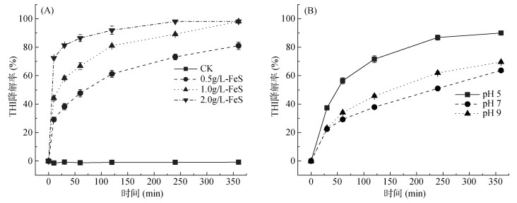 图 4 不同浓度FeS(A)和不同pH条件(B)下THI厌氧还原降解率变化情况 Fig. 4 Anaerobic reduction degradation rates of THI under different FeS concentrations (A) and pH values (B) |