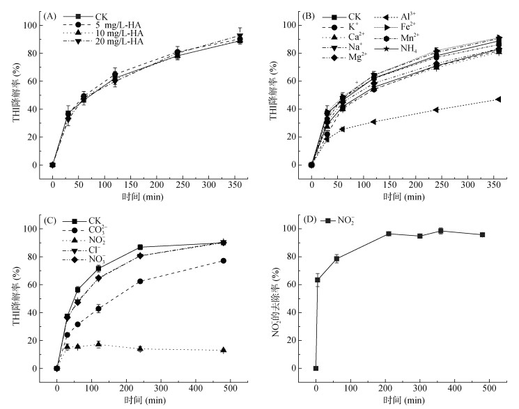 2.2.2 共存离子对THI降解的影响环境中天然有机物和无机阴、阳离子的存在可能对FeS介导的THI降解存在影响[27-28],因此,本研究选择腐殖酸(HA)作为代表性天然有机质,选择Cl-、NO3-、CO32-和NO2-作为代表性无机阴离子,K+、Ca2+、Na+、Mg2+、Al3+、Fe2+、Mn2+、NH4+作为代表性无机阳离子,探究在这些有机质或离子存在的条件下FeS对THI降解的影响。如图 5A所示,HA对FeS介导的THI降解没有明显影响,当加入5、10和20 mg/L的HA时,反应360 min后THI降解率分别为90.3%、89.3% 和92.8%。