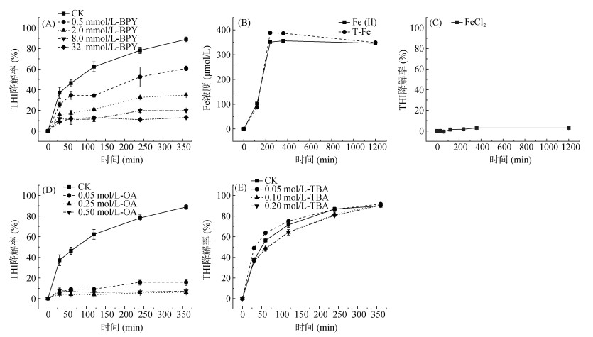 2.2.3 FeS还原降解THI的机制探究由于2, 2′-联吡啶(BPY)对Fe(Ⅱ)有很强的络合能力,因此其能快速螯合和钝化溶液和固相Fe(Ⅱ)。如图 6A所示,在厌氧FeS悬浮液中添加0.5 mmol/L的BPY,反应360 min后,THI降解率从88.9%显著下降到60.8%,并随着BPY浓度增加到32 mmol/L时降解率下降到13.1%。该结果证实Fe(Ⅱ)是FeS还原降解THI的主要活性中心,是THI还原的最终电子供体。图 6B为该体系中Fe(Ⅱ)和T-Fe的释放情况,可见,随着反应进行FeS中的铁以溶解态Fe(Ⅱ)的形式不断释放至溶液中,反应360 min后溶液中Fe(Ⅱ)和T-Fe的浓度分别为356 μmol/L和386 μmol/L。为考察释放的溶解态Fe(Ⅱ)在厌氧条件下是否对THI的降解具有贡献作用,因此选取浓度为1 g/L的FeCl2进行探究,结果如图 6C所示,溶解态Fe(Ⅱ)对THI并无降解作用。