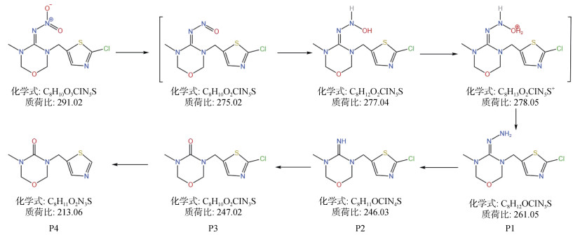 2.2.4 降解途径本研究采用HPLC-MS/MS检测FeS还原THI的降解产物,并提出了THI降解的可能途径,如图 7所示。首先,THI分子中的–NO2上带负电的O原子与FeS上带正电的硫空位结合,并发生电子转移使其断键,形成亚硝胺中间体,进一步亚硝基发生水解作用被消除转化为–NH2,形成对应的伯腙产物(P1);随后,–NH2官能团会进一步发生还原脱胺基作用,脱硝基THI(P2);产物P2的胺基会进一步发生水解反应,形成尿素–THI代谢产物(P3);在厌氧还原条件下,噻虫嗪中的五元噻唑环上的–Cl基团也会被FeS进一步还原去除,形成对应的脱氯产物(P4)[36-37]。综上,本研究提出FeS还原降解THI的两条路径:还原脱硝和还原脱氯。