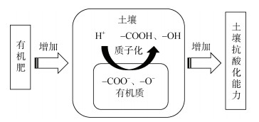 Nelson和Su[120]的研究发现,随着土壤深度的增加,土壤pHBC逐渐降低,这也表明,随着土壤有机质含量的降低,土壤pHBC降低。目前学者们普遍认为土壤有机质中含有的羧基、酚羟基等弱酸性官能团离解产生的有机阴离子通过质子化作用消耗质子,从而提高了土壤pHBC[57, 62]。这是土壤有机质阻控土壤酸化的主要机制(图 1)。